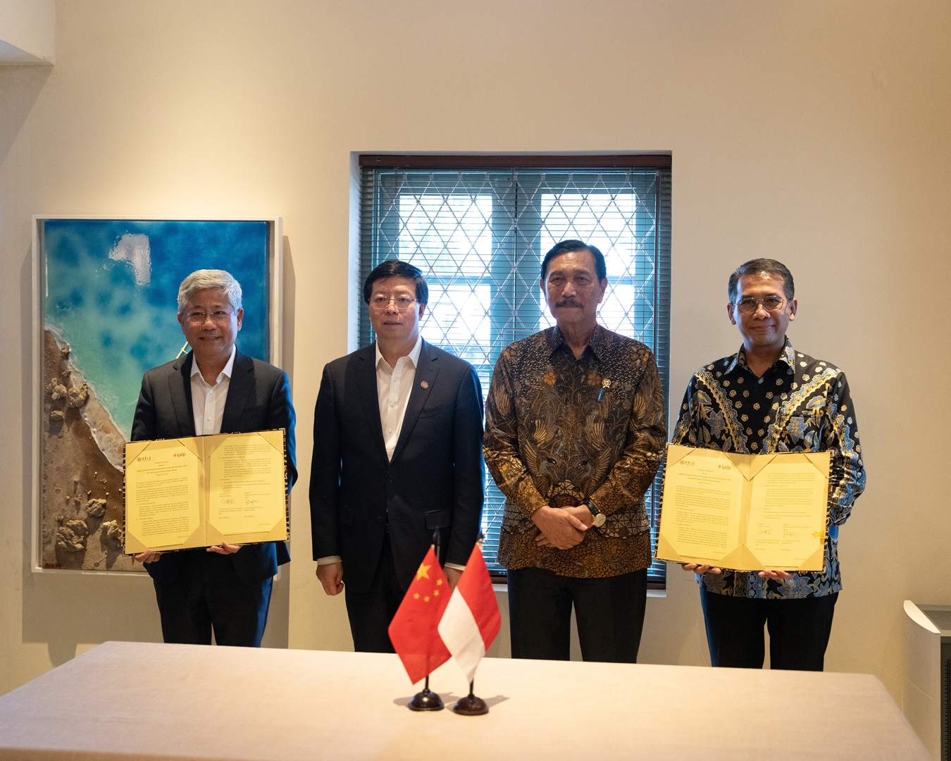 Direktur Utama LPDP Andin Hadiyanto dan Dekan Tsinghua SEM Bai Chong-en menunjukkan nota kesepakatan yang turut disaksikan oleh Menko Marves Luhut Binsar Panjaitan