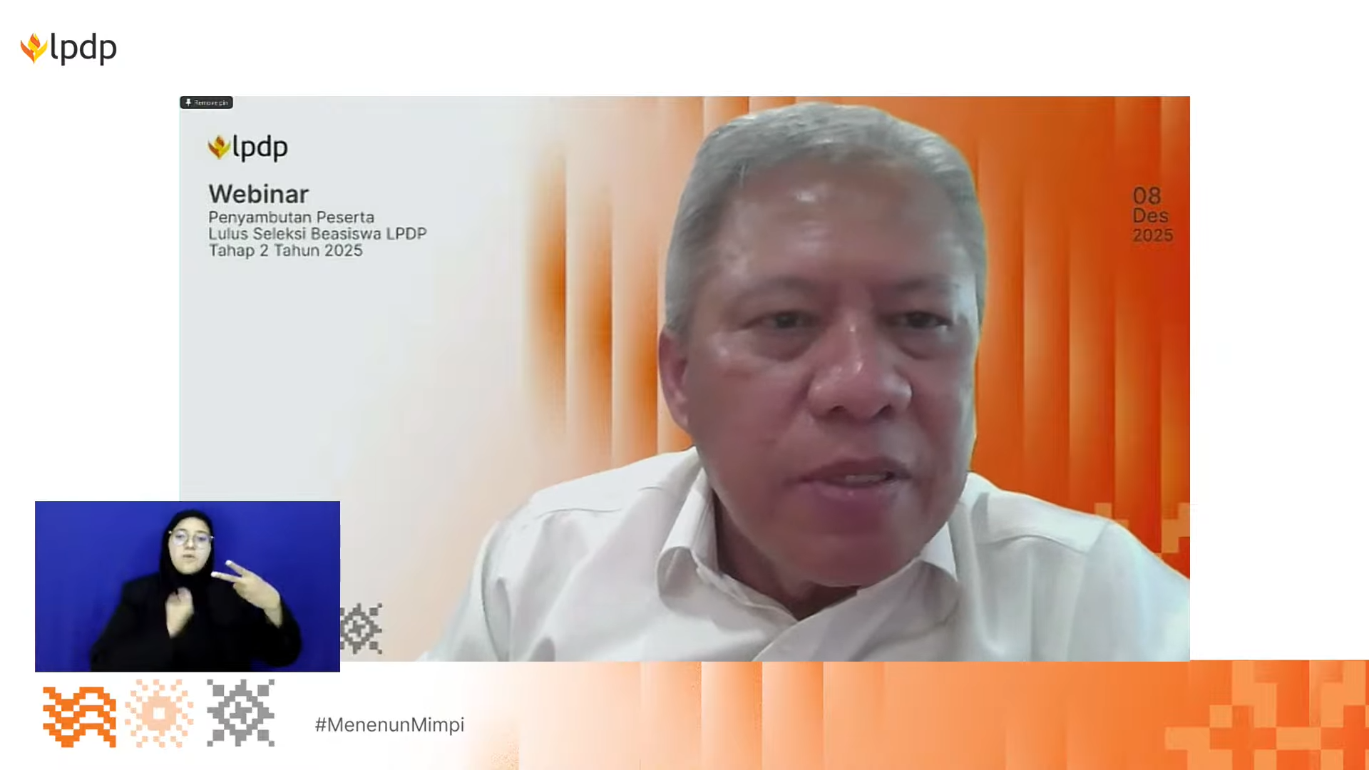 Webinar Penyambutan Peserta Lolos Seleksi Beasiswa LPDP Tahap 2 Tahun 2025 oleh Direktur Beasiswa Dwi Larso. Dok YouTube LPDP