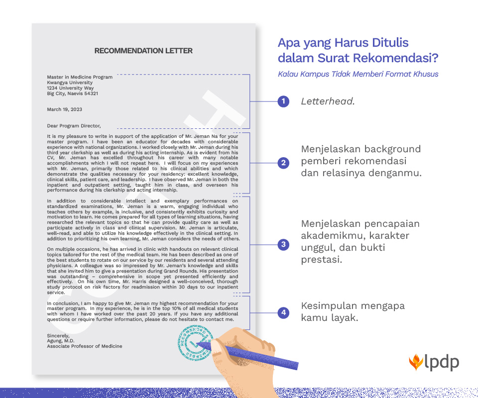 Layaknya melamar pekerjaan di sejumlah instansi, keberadaan surat rekomendasi menjadi bagian yang disyaratkan ketika kamu ingin mendaftar kampus tujuan atau mencari LoA. Surat rekomendasi adalah dokumen yang menjelaskan kualifikasi, karakter, dan kemampuan secara akademik maupun profesional sebagai calon penerima beasiswa.